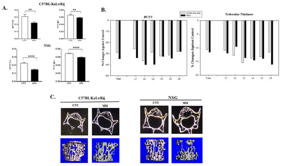 The BV/TV and Tb.Th were significantly reduced in MM NSG mice from control mice (no-MM) (p < 0.0001), while these parameters were also considerably reduced (p = 0.005 and 0.009) in C57BL/KaLwRij mice (Figure 4A). The p-value differences come from variations of C57BL/KaLwRij since its standard errors were two to three folds higher than NSG mice. The percent reduction rates were calculated against the control and expressed in Figure 4B to compare each lumber. Both graphs showed unequal bone lesions in each lumbar. In the BV/TV, L2 of C57BL/KaLwRij and L2/3 of NSG showed higher reduction rates. In Figure 4C, the representative transverse microCT images and 3D-reconstructed images of the trabecular region in the vertebral body of corresponding lumbar (L3) from Control and MM mice are shown here. Although both images demonstrated significant bone loss on the trabecular region of the lumbar, 3D-reconstructed images showed further bone loss in the NSG model, in agreement with Figure 4B. These results demonstrate that both models induce significant bone loss, but the NSG model has more severe bone loss than C57BL/KaLwRij model.