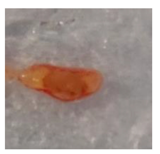 Subsequently, the identified lymph node(s) were assessed, and the percutaneous CNB of the SLN was performed with ultrasound guidance under local anesthesia (Figure 2). The CNB was evaluated for the presence of brown staining and magnetic uptake with the SentiMag probe (Figure 3). If more than one pathological lymph nodes were identified at this stage, the protocol stated that multiple efforts could be performed only after patient consent; otherwise, if the bioptic material obtained was considered representative and adequate, only the most prominent node was biopsied. Standard histopathologic analyses to assess metastasis was also performed, including verification of SPIO presence in the SLN. In patients undergoing NAT, the SLN was clipped simultaneously after the CNB, at the same session. When CNB was completed, the area was scanned for bleeding.