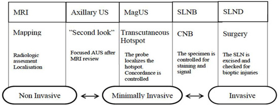 The development of an integrated technique bridging non-invasive and minimally invasive procedures for enhancement of the standard, axillary ultrasound-based diagnostic work-up is highly relevant [23,24,25]. The aim of this study was to determine whether the preoperative work-up with SPIO MRI-LG and Magnetic-guided Axillary UltraSound (MagUS), can accurately localize SLNs and predict SLN status and whether such a technique has the potential of replacing SLN surgery in the future.