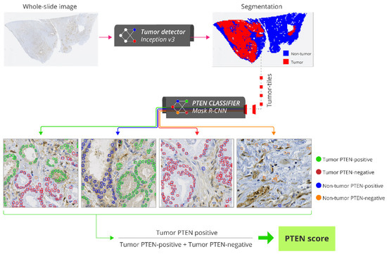 Pipeline for fully-automatic PTEN scoring. Each whole slide image (WSI) of an IHC-stained slide is partitioned into smaller, non-overlapping regions called tiles with 800 × 800 pixels (40x lens). The tiles are classified as tumor or non-tumor by the tumor detector. Tumor tiles are processed by the PTEN classifier which detects and quantifies tumor PTEN-positive, non-tumor PTEN-positive, tumor PTEN-negative and non-tumor PTEN-positive cells. PTEN score for a WSI is calculated as the ratio between the number of tumor PTEN-positive cells and the total number of tumor PTEN-positive and PTEN-negative cells. Abbreviations: PTEN = phosphatase and tensin homologue.