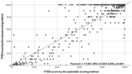 Of the 777 IHC-stained slides from 259 patients, automatic PTEN scores were obtained for 735 WSIs from 259 patients and manual PTEN scores for 704 WSIs from 256 patients. Fewer WSIs were scored manually due exclusion of cases with technical failures following quality control of the staining, which was not performed for automatic scoring (Figure S2). The correlation between the automatic and manual scores of the same WSIs was strong (Pearson’s r = 0.931, 95% CI 0.921 to 0.940) (Figure 2). The AUC was 0.987 (95% CI 0.968 to 0.994).