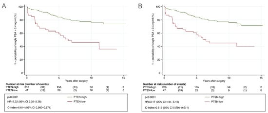 In the primary analysis, patients automatically assessed as PTEN-low had a significantly higher risk of BCR compared to patients automatically assessed as PTEN-high (HR = 3.32, 95% CI 2.05 to 5.38 and c-index = 0.614, 95% CI 0.560 to 0.671, Figure 3A). A similar prognostic value was observed for the manually assessed PTEN status (HR = 3.17, 95% CI 1.94 to 5.16, Figure 3B). Automatically assessed PTEN status was associated with TTBCR in CAPRA-S high-risk patients and in those with GGG ≤ 3 tumors in the analyses including routine GSs (Figure S3), and additionally in CAPRA-S low-risk patients and in those with GGG > 3 tumors in the analyses including centrally reviewed GSs (Figure S4). It was also significantly associated with TTBCR in multivariable analysis including routine GSs (HR = 2.24, 95% CI 1.24 to 4.07, p = 0.008) and centrally reviewed GSs (HR = 1.86, 95% CI 1.01 to 3.40, p = 0.045). The c-index for the standard CAPRA-S score including routine GSs was 0.807 (95% CI 0.750 to 0.851) and 0.812 (95% CI 0.755 to 0.855) for the CAPRA-S score integrated with PTEN status. The difference between these c-indices was 0.005 (95% CI −0.003 to 0.016).