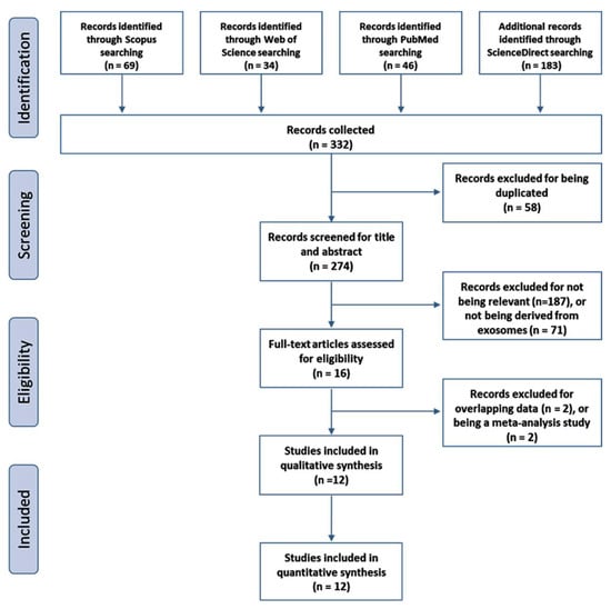 A total of 332 articles were initially screened, and 274 articles remained after 58 duplicates were eliminated. The literature was then screened according to title and abstract, and 187 more studies were excluded for being irrelevant and an additional 71 articles for not being derived from circulatory exosomes. The full text of the remaining 16 studies was reviewed in-depth, and 4 additional studies were excluded. Finally, the remaining 12 articles, including 1164 patients and 540 controls, met the inclusion criteria (Figure 1). Apart from a single study [25], all articles were conducted in China [21,26,27,28,29,30,31,32,33,34,35]. They were published between 2016 and 2021. The sample size ranged from 10 to 491 patients per study (Table 1). Quantitative Real-Time Reverse Transcription Polymerase Chain Reaction (qRT-PCR) was utilized in miRNA profiling of circulatory exosomes. Evaluation of study quality using the NOS scale demonstrated the high quality of all articles with scores of either 7 or 8 (Figure S1). However, evaluation of the enrolled studies according to the MISEV guidelines revealed a score range from 3 to 8 (Table 1).
