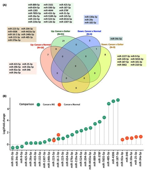 Deregulated exosomal miRNAs in thyroid cancer. (A) Venn diagram shows the intersection between aberrantly expressed miRNAs across studies with different comparisons [25,26,28,30,31,32,33,34,35]. The Venn diagram was plotted online (http://www.interactivenn.net/) (accessed on 15 July 2021) [36]. (B) The lollipop plot shows the fold change of deregulated miRNAs in datasets comparing cancer versus normal and cancer versus nodular goiter. Only miRNAs with reported expression level values are shown [30,32,33,35]. R package ‘ggplot2′ and ‘ggpubr’ were used.