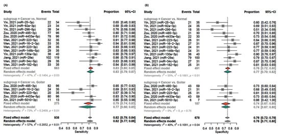 Sensitivity and specificity of exosomal miRNAs stratified by type of comparison. Each row in the forest plot represented the miRNA result of a study/dataset. Estimate and confidence intervals are shown as box and bar. Pooled result of the subgroup analysis is shown separately in red (cancer versus normal) and green (cancer versus nodular goiter) diamonds. Heterogeneity was assessed using the Q test, and the magnitude of heterogeneity was quantified using I2. If I2 exceeded 50%, heterogeneity across studies was reported, and random-effects model results were considered; otherwise, a fixed-effects model was used. The final overall results are illustrated in the lower panel with grey diamonds. (A) Forest plot for the sensitivity of testing exosomal miRNAs. (B) Forest plot for the specificity of testing exosomal miRNAs. R package ‘meta’ was used.