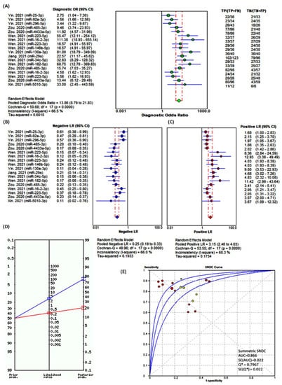 Effectiveness of exosomal miRNAs as a diagnostic test. All tested miRNAs were upregulated in cancer patients except miR-130a-3p, miR-29a, miR-34c-5p, miR-182, 5p, and miR-5010-3p. (A) Diagnostic odds ratio. It is defined as the odds of the test being positive if the subject has cancer relative to the odds of the test being positive if the subject does not have the disease (=PLR/NLR). The higher diagnostic odds ratios are indicative of better test performance. The DerSimonian–Laird pooling method was used [37]. (B) Negative likelihood ratio. It gives the odds of having a diagnosis in patients with a negative test. The change is in the form of a ratio, usually less than 1. The smaller the -LR, the more informative the test. (C) Positive likelihood ratio. It is the ratio of the probability that a positive test result is expected in a diseased individual to the probability that a positive result occurs in a healthy subject. It tells us how many times it is more likely to observe a positive test result in a diseased than in a healthy individual. The more the likelihood ratio for a positive test (+LR) is greater than 1, the more likely the disease is. (D) Fagan’s Bayesian nomogram for the 18 combined miRNA panel. Lines are then drawn from the prior probability on the left through the likelihood ratios in the center and extended to the posterior probabilities on the right. Pretest probability on the left vertical line, likelihood ratio in the middle vertical line. The predicted posttest probability is on the right vertical line. Pooled results showed a moderate shift in posttest probability. With the prior probability of 50%, the probability of the disease increases to 76% (95%CI = 74–78%) with positive test results and decreases the probability of having the disease to 20% (95%CI = 17–22%) in the presence of a negative test. (E) Summary ROC curve. It is created by plotting the true positive rate (sensitivity) against the false positive rate (1-specificity). Symmetric sROC curve fitted using Moses’ Model (weighted regression: inverse variance). Significant miRNA testing for cancer versus normal in red circles and for cancer versus nodular goiter in yellow circles. The position of the dots depends on their discriminatory ability; the more accurate the test is, the closer the curve to the upper left-hand corner of the ROC plot. The middle blue line indicates the estimated sROC curve, surrounded by two other lines for the 95% confidence region for the summary estimate. Q* is the point of the curve in which sensitivity equals specificity. Meta-DiSc v1.4 was used for meta-analysis (https://meta-disc.software.informer.com/1.4/) (accessed on 8 June 2021) [38].