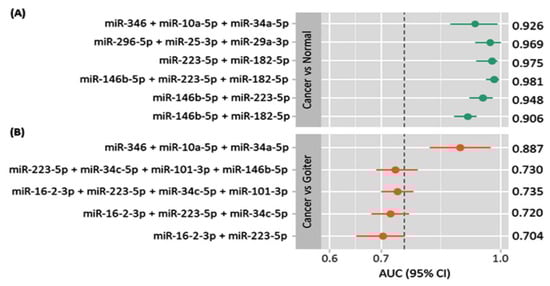 Comparison of the diagnostic accuracy of various miRNA-based panels. Area under the curve (AUC) and 95% confidence interval (CI) of the receiver operator characteristic curve analysis for each panel are plotted [30,32,35]. The threshold for optimum diagnostic accuracy was set at 0.75. Subgroup analysis for exosomal miRNA expression was carried out based on the type of comparison. (A) Cancer compared to normal subjects; (B) cancer compared to nodular goiter.