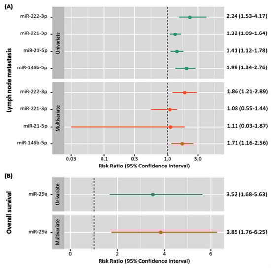 Univariate and multivariate analyses of the prognostic factors for exosomal miRNAs. (A) for the lymph node metastasis; (B) for the overall survival. Data are shown as relative risk and 95% confidence interval for univariate and multivariate analyses [21,28].
