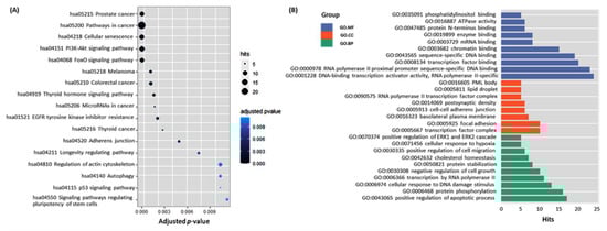 Functional enrichment analysis. (A) KEGG pathway enrichment. Top enriched pathways are represented in a scatter plot. The vertical axis represents the pathname, and the horizontal axis represents the q-value. The color of the point represents the size of the q-value. The number of differential genes included in each pathway is expressed by the size of the point. (B) The vertical axis represents the gene ontology term, and the horizontal axis represents the number of gene targets (hits) for 3′UTR, CDS, and 5′UTR in that GO. The top significantly enriched terms with q values < 0.05 were considered. Data source: MirWalk 3.0 (http://mirwalk.umm.uni-heidelberg.de/) (accessed on 12 June 2021), using the following filter: 0.95, Targetscan, miRDB, and miRTarbase.