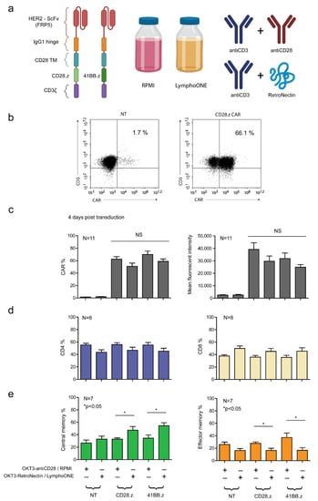 Generation of FRP5-derived HER2-CAR T cells with the two distinct cell culturing and two distinct stimulating methods, and assessing their distribution of CD4/CD8 and memory phenotypes. (a) Schematic diagram illustrating the modular composition of the CD28.z and 41BB.z HER2-CARs, the two media (RPMI and LymphoONE), and the two stimulation methods (antiCD3+antiCD28 and antiCD3+RetroNectin) applied in the experimental approach. (b) Representative flow cytometry dot-plot of CD28.z HER2-CAR T cells and non-transduced T cells. (c) HER2-CAR expression quantified using a HER2-Fc fusion protein followed by Alexa Fluor 647-conjugated anti-human IgG staining (n = 11). (d) CD4 and CD8 positivity tested by labeling with FITC-conjugated CD4 and Alexa Fluor 647-conjugated CD8 4 days post-transduction (n = 8). (e) Naïve (CCR7, CD45RA double-positive), central memory (CCR7-positive, CD45RA-negative), effector memory (CCR7, CD45RA double-negative), and terminal effector (CCR7-negative, CD45RA-positive) phenotype determined by labeling with FITC-conjugated anti-human CCR7 and APC-conjugated anti-human CD45RA 4 days post-transduction (n = 7). Histograms of the naïve and terminal effector phenotype frequency are provided in Supplementary Figure S2. Histograms represent the mean ± SD (OKT3-antiCD28/RPMI vs. OKT3-RetroNectin/LymphoONE: * p < 0.05).
