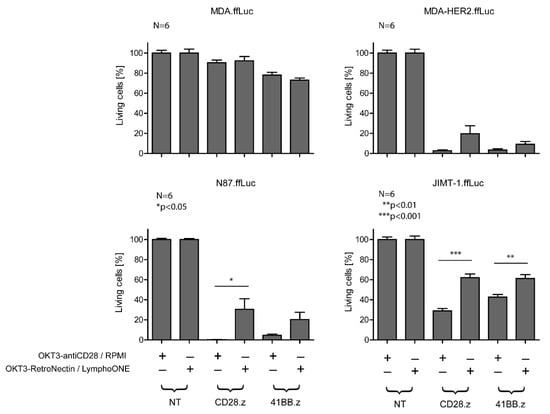 In vitro cytotoxicity of HER2-CAR T cells prepared with the two different stimulation protocols. The cytotoxic activity of CAR T cells was determined by a luciferase-based killing assay. MDA-HER2.ffLuc, N87.ffLuc, and JIMT-1.ffLuc were plated in 96-well flat-bottom plates at a concentration of 106 cells/well in duplicates. After 4 h, 106 CD28.z and 41BB.z HER2-CAR T cells prepared with the two different stimulation protocols were added. After 24 h, luciferase activity was determined. Empty media, NT T cells, HER2+ target cells cultured without the presence of effector cells, and the MDA.ffLuc cell line served as controls. Histograms represent the mean ± SD (n = 6, OKT3-antiCD28/RPMI vs. OKT3-RetroNectin/LymphoONE: * p < 0.05, ** p < 0.01, *** p < 0.001).