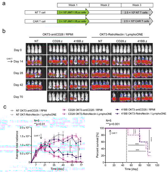 Having established that EM-enriched CAR T cell products had greater anti-tumor activity in vivo, we wanted to determine if this correlates with greater expansion and/or persistence post-infusion. We performed the same in vivo experiments as described above with the only difference being that this time, CAR T cells expressed ffLuc (NT.ffLuc, CD28.z.ffLuc, 41BB.z.ffLuc) and not the JIMT-1 tumor cells (Figure 6b). EM-enriched CD28.z CAR T cells expanded faster and for a longer time period than CM-enriched T cell products (OKT3-anti-CD28/RPMI CD28.z.ffLuc vs. OKT3-RetroNectin/LymphoONE CD28.z.ffLuc, p < 0.01, Figure 6b,c). In accordance with this result, EM-enriched 41BB.z CAR T cells also outperformed their less differentiated counterparts (OKT3-anti-CD28/RPMI 41BB.z.ffLuc vs. OKT3-RetroNectin/LymphoONE 41BB.z.ffLuc, Figure 6b,c). 41BB.z CAR T cells expanded slowly post-infusion for the entire duration of the experiment, whereas CD28.z CAR T cells contracted after their initial expansion. NT.ffLuc T cells did not expand, in coherence with having no anti-tumor activity (Figure 6b,c).