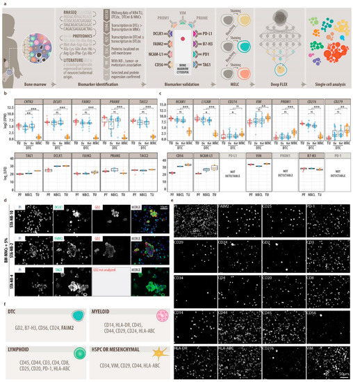 Therefore, in our workflow (Figure 1a), we first selected DTC-associated biomarkers in a multi-omics data mining approach, which we then validated separately by conventional IF staining. Data mining based on RNA-seq data of stage M neuroblastoma primary tumors, DTCs, and bone marrow-derived mononuclear cells (MNCs); proteomics data of neuroblastoma tumors, neuroblastoma cell lines, and peripheral-nerve-associated fibroblasts; and public databases (Uniprot, Protein Atlas, PubMed) revealed 12 DTC-related biomarkers that were highly or exclusively expressed by DTCs and primary tumor cells and localized to the cytoplasmic membrane (Figure 1b,c) [20,70,71,72,73]. These 12 DTC-related biomarkers were tested using optimized IF-sample preparation protocols in a systematic validation procedure (Figures S3a,b and S4a, Table S12) on neuroblastoma cell lines in isolation (Figure S3c, Table S1) and spiked into MNCs (Figure 1d and Figure S4b). Upon validation (Table S13), FAIM2, which was highly abundant by proteomics specifically in neuroblastoma cells (Figure S5), GD2, CD56, VIM and B7-H3 were selected for multiplex imaging of DTCs (Figure 1e).