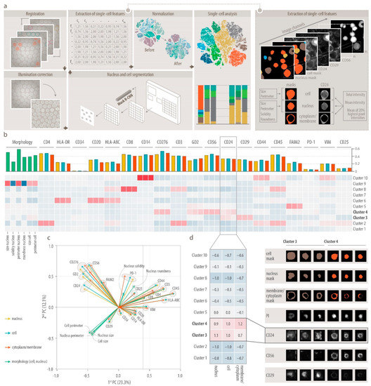 DeepFLEX and feature validation. (a), Schematic overview of the deep learning-based image processing (registration, illumination correction), segmentation, feature extraction, normalization and single-cell analysis pipeline DeepFLEX. Single cells are described by the intensity and morphological features. Morphological features: size and perimeter (of cell and nucleus), and solidity and roundness (of nucleus). Intensity features: total intensity, mean intensity and mean of 20% highest pixel intensities per cell compartment (cell, nucleus and cytoplasm with membrane) and marker. In total, nine intensity features per marker plus six morphological features. (b), Evaluating the contribution of cell compartment and morphological features to cell clustering (consensus clustering using Bioconductor package cola) using 2021 single-cell vectors, comprised of the mean of the 20% highest pixel intensities (M20) to measure marker intensity and morphological features, from one representative bone marrow (BM) sample (1.FoV of BM 1.1, Table S2). Signature heatmap showing scaled mean per cluster and feature. Barchart showing the maximal difference between significantly (F-test with FDR-corrected p-value < 0.05) different clusters per feature. Green, morphological features; blue, M20 in cell: yellow; M20 in nucleus; red, M20 in cytoplasm with membrane. (c), Biplot representation of principal component analysis (PCA) on the autoscaled data (single-cell vectors, comprised of M20 of each marker and morphological features) in one representative BM sample (1.FoV of BM 1.1), showing the projection of the data set in the PC1xPC2 plane. Length of adjacent and opposite leg of arrows show contribution to first and second principal components, respectively. Green, morphological features; blue, M20 in cell: yellow; M20 in nucleus; red, M20 in cytoplasm/membrane. (d), Left, scaled mean of CD24 marker intensity (M20) higher in cell and nucleus than in cytoplasm/membrane in cluster 3 and vice versa in cluster 4; right, Gallery images of cell, nucleus and cytoplasm/membrane segmentation masks, and propidium iodide (PI), CD24, CD56 and CD29 MELC stainings for three representative cells from cluster 3 and 4.