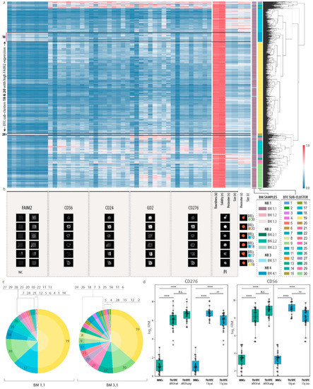 To assess tumor heterogeneity of bone marrow metastatic cells, we next performed hierarchical clustering on the single-cell data of the DTC cluster using only the DTC markers from our 20-plex MELC panel. We obtained a clustermap with 30 DTC sub-clusters ranging from clusters with very high co-expression of GD2, CD56, CD24 and CD276 to such characterized by only one or two of these markers (Figure 4a). Heterogeneous marker expression was also reflected by representative gallery images of individual DTC phenotypes (Figure 4b). Notably, half of all DTCs belonged to sub-cluster 19, which represented a dominant phenotype in the two highly tumor-infiltrated bone marrow samples BM 1.1 and BM 3.1 (63% and 2.9%, respectively; Figure 4c). While DTCs showed a round nuclear shape, cellular and nuclear size contributed to the fractionation of DTCs into distinct sub-clusters and varied between different phenotypes, e.g., 17 and 30, which was composed of large and small cells, respectively. Sub-cluster 18 and 20 displayed a high expression of FAIM2, an inhibitory protein in the Fas-apoptotic pathway of tumor cells [83,84], which was proposed as a tumor marker in small cell lung [85] and breast cancer [86]. FAIM2 is known to be primarily expressed in neurons [83,87], which was in accordance with our bulk proteomics data (Figure S5a). In our RNA-seq datasets, FAIM2 transcription was significantly higher in tumor cells than in bone marrow-derived MNCs (Figure S5b). Moreover, FAIM2 transcription was enriched in primary tumor cells without MYCN amplification as compared to those with MYCN amplification (Figure S5b), thus supporting previous findings [88]. However, we did not observe a differential expression between these two classes in DTCs. Interestingly, in our single-cell analysis of eight neuroblastoma bone marrow samples, FAIM2 was expressed only in a subset of DTCs (Figure 3e and Figure 4a,b). As other markers that were found to be expressed by DTCs, FAIM2 was not exclusive to neuroblastoma cells, but was also found on other cell types in the bone marrow (Figure 3e and Figure S13). To assess the correlation of FAIM2 and other DTC markers, we plotted the respective marker abundances for all cells of all clusters (Figure 3e) and the DTC cluster only (Figure S14). This corroborated the observation, that only a subset of DTCs exhibit a high expression of FAIM2 along with low or intermediate abundances of the other DTC markers, while the latter, GD2, CD56, CD274 and CD24, were mostly co-expressed by DTCs. We further explored whether expression of these markers was dependent on the genetic subtype and evaluated our RNA-seq dataset for DTC marker expression in neuroblastoma with and without MYCN-amplification, loss of chromosome 11q or other neuroblastoma-specific genetic aberrations (Figure 4d and Figure S15). While FAIM2 and GD2 expression was constant, CD56 and CD276 were significantly lower in tumors and DTCs that carried a chromosome 11q loss, but showed no significant differential expression in other genetic subtypes, suggesting heterogeneity between patient groups with specific genetic alterations in addition to heterogeneity at the single-cell protein level.