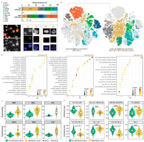 Changes in the cell composition associated with the presence of tumor cells in the bone marrow. (a), Bar charts demonstrating the cell composition in bone marrow samples with no/low and high tumor cell infiltration. DTCs, disseminated tumor cells; Myel., myelocytes; MO/MΦ, monocytes/macrophages; Mes. cells, mesenchymal cells; HSPC, hematopoietic stem and progenitor cells; T-h cells, T-helper cells; CTLs; cytotoxic T-lymphocytes; Mixed, hematopoietic mixed cell population. (b), A-tSNE plot of 35,700 single cells highlighted by samples with high (left, BM 1.1, BM 3.1) and no/low (right, BM 1.2, BM 1.3, BM 2.1, BM 2.2, BM 2.3, BM 4.1) tumor cell infiltration and colored by cell type. Dimensionality reduction was performed by A-tSNE (approximated and user steerable t-distributed Stochastic Neighbor Embedding) and subsequent clustering by GMS (Gaussian Mean Shift) in Cytosplore. (c), FISH analysis with chromosome 17q-specific probe on MELC-preprocessed sample BM 1.1, collected from a patient with 17q gain. Nucleus segmentation mask (left, top) pseudo-colored according to cell type and based on propidium iodide image (right, bottom) acquired during MELC. Six copies of 17q (red) were detected on DTCs (D, orange) and 2 on myelocytes (M, brown). The 17p reference probe did not yield interpretable results due to preprocessing of the sample by MELC. Nuclei were counterstained with DAPI (blue). (d), RNA-seq analysis of MACS separated GD2 negative bone marrow MNC fraction of DTC-infiltrated (n = 17) and non-infiltrated (n = 21) bone marrow. Top 20 significantly (p.adj < 0.05; p.adj = BH-adjusted p-value) positively enriched (NES > 0; NES = normalized enrichment score) gene sets from GOBPs (GO-biological processes), hallmark and KEGG gene set collections as determined by GSEA (gene set enrichment analysis) (Table S11) performed on log2FC ranked gene list are shown for bulk RNAseq data of the MNC fraction from tumor-infiltrated vs. non-infiltrated bone marrow. Count—core_enrichment size; GeneRatio—core_enrichment size divided by setSize. (e), six genes implicated in inflammation, immuno-suppression and neutrophil attraction from the top 50 significantly (p.adj < 0.05 and log2FC > 1; p.adj = BH-adjusted p-value) upregulated genes (Table S10) in bulk RNAseq data of the MNC fraction from tumor-infiltrated vs. non-infiltrated bone marrow. Regularized log2, regularized logarithm (rlog) transformed counts normalized with respect to library size; U, unstranded; SR, stranded protocol. (f), Single-sample gene set enrichment analysis (ssGSEA) of selected gene sets for bone marrow-derived cell types (MSigDB—C8: HAY_BONE_MARROW_) in bulk RNAseq data of the MNC fraction from tumor-infiltrated vs. non-infiltrated bone marrow. Enrichment score—normalized enrichment score as calculated by GSVA ssgsea algorithm, p-values—calculated using unpaired two-samples Wilcoxon test (R function wilcox.test()).