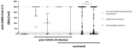 Antibody titers determined ≥10 days after the first vaccination dose in patients without a past history of a COVID-19 infection were included; antibody titers determined before day 10 (nine solid tumor and eight hematologic patients) were excluded from this study. Overall, data of 171 solid tumor patients were analyzed (84 female, 87 male; median age 66 years, range: 28–90 years). The median time of antibody determination after the first vaccination was 50 days (range: 12–122 days). The median BAU/mL value of this cohort was 250.0 (95% CI of median: 250.0–250.0). In contrast, the median BAU/mL value of the hematologic patient cohort (107 patients, 49 female, 58 male; median age 74 years, range: 25–89 years) was 17.9 (95% CI of median: 4.89–76.70). The median time of antibody determination after the first vaccination was 49 days (range 10–130 days; Figure 1, Table S1). Significantly higher antibody levels were obtained in vaccinated solid tumor and vaccinated hematologic patients when compared to the non-vaccinated control group (non-vaccinated vs. vaccinated solid tumor patients: p < 0.0001; non-vaccinated vs. vaccinated hematologic patients: p < 0.0001; Figure 1). Of note, antibody levels were significantly higher in vaccinated solid tumor patients than in hematologic patients (p < 0.0001; Figure 1).