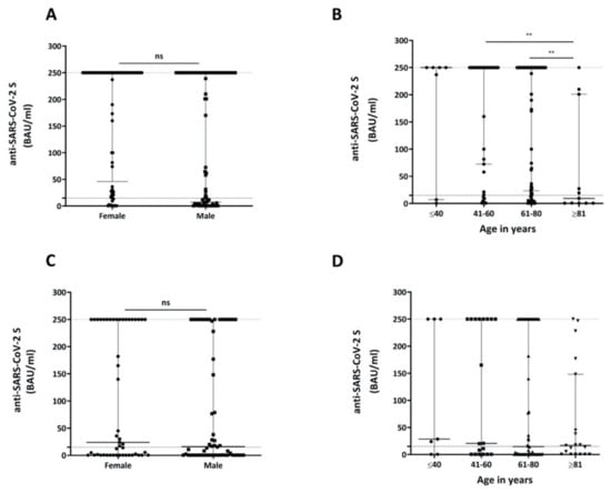 Figure 2. Comparison of antibody levels based on gender or age. (A) Comparison of antibody levels after COVID-19 vaccination in solid tumor patients stratified by gender. (B) Comparison of different age groups of solid tumor patients with respect to antibody formation upon COVID-19 vaccination. (C) Comparison of antibody levels after COVID-19 vaccination in hematologic patients stratified by gender. (D) Comparison of different age groups of hematologic therapies with respect to antibody formation upon COVID-19 vaccination. Threshold (lower dotted line) indicates ≥15 BAU/mL; the upper dotted line shows the upper limit of the assay (250.01). Displayed are median values and 95% CI of BAU/mL values (upper and lower ends of error bars). BAU: Binding Antibody Units, ns: not significant; ** p < 0.01.
