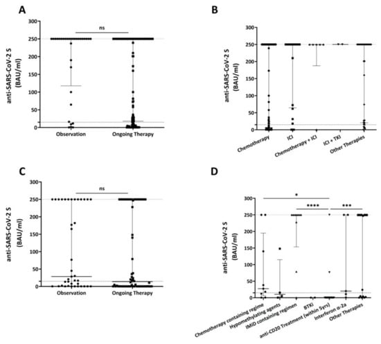 Figure 3. Comparison of antibody levels based on oncological treatment. (A) Comparison of antibody levels after COVID-19 vaccination in solid tumor patients that were observed only with patients receiving any type of oncologic therapy. (B) Comparison of different oncologic therapies with respect to antibody formation upon COVID-19 vaccination. (C) Comparison of antibody levels after COVID-19 vaccination in hematologic patients that were observed only with patients receiving any type of hematologic therapy. (D) Comparison of different hematologic therapies with respect to antibody formation upon COVID-19 vaccination. Here, only selected therapies were analyzed. Threshold (lower dotted line) indicates ≥15 BAU/mL; the upper dotted line shows the upper limit of the assay (250.01). Displayed are median values and 95% CI of BAU/mL values (upper and lower ends of error bars). ns: not significant, * p < 0.05, *** p < 0.001, **** p < 0.0001. BAU: Binding Antibody Units; ICI: Immune Checkpoint Inhibitor; TKI:Tyrosine Kinase Inhibitor; IMID: Immunomodulatory Imide Drug; BTKi: Bruton’s Tyrosine Kinase Inhibitor.