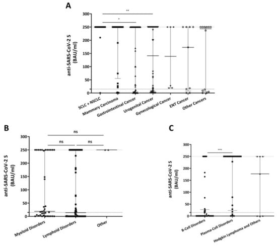 Figure 4. Comparison of antibody levels stratified by type of solid tumor type (A) or type of hematologic disease (B). (C) Comparison of antibody levels after COVID-19 vaccination in hematologic patients with lymphoid diseases grouped by cell of origin of the disease. Threshold (lower dotted line) indicates ≥15 BAU/mL; the upper dotted line shows the upper limit of the assay (250.01). Displayed are median values and 95% CI of BAU/mL values (upper and lower ends of error bars). BAU: Binding Antibody Units, SCLC: Small Cell Lung Cancer, NSCLC: Non-Small Cell Lung Cancer, ENT: Ear-Nose-Throat. ns: not significant, * p < 0.05, ** p < 0.01, *** p < 0.001.