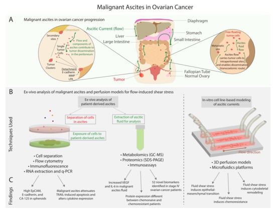 Compared to other gynecological malignancies (cervical, uterine, vaginal, and vulva), patients with ovarian cancer suffer from the highest mortality rates [,]. In 2021, an estimated 21,410 patients in the United States will be diagnosed with ovarian cancer and 13,770 will succumb to the disease []. By 2035, it is predicted that this number will rise by 67% to >250,000 patients [,]. Due to a lack of early detection methods, patients most often present with advanced-stage (III or IV) disease, limiting opportunities for therapeutic intervention. Advanced-stage ovarian cancer is frequently associated with the accumulation of fluid in the abdomen, known as ascites, which is comprised of cellular and acellular components. Cellular components of malignant ascites include tumor cells, which can exist as individual cells or spheroids, and stromal cells, which include fibroblasts, inflammatory cells, and endothelial cells [,]. The presence of these cell populations in ascitic fluid is indicative of underlying malignant tumors in the peritoneal cavity [,]. Acellular factors in malignant ascites include cytokines, such as interleukin (IL)-6 IL-8, proteins, and various metabolites [,]. These cellular and acellular factors provide tumor cells with a growth-promoting and immune-evading microenvironment, enabling phenotypic changes within tumor cell populations and facilitating chemoresistance. As shown in Figure 1, malignant ascites promotes tumor dissemination to intraperitoneal sites by means of biochemical and physical cues which have been modeled experimentally using ex vivo analysis of human samples and in vitro methods with cell lines [,,,,].