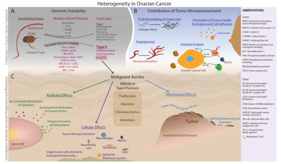 Illustration of Heterogeneity in Ovarian Cancer. (A) Contributing tissues and mutated or altered pathways in both type I and type II tumors are illustrated along with various subtypes included in each tumor type. Since HGSOC, a type II tumor, is the focus of this review, the frequency of mutated/altered pathways in type II tumors are noted as percentages, but the frequency of mutated/altered pathways in type I tumors has been omitted. (B) The tumor microenvironment also contributes to intertumoral heterogeneity via ECM remodeling through increased production of collagen, promotion of tumor cell cluster formation and adhesion to secondary intraperitoneal sites, increased angiogenesis through neovascularization, and immune evasion through the involvement of Tregs, NK cells, and MDSCs. (C) The presence of malignant ascites is more frequently associated with type II tumors than type I tumors, and ascites contributes to a tumor-promoting microenvironment through acellular, cellular, and biophysical cues. Acellular factors, including cytokines, growth factors, and integrins, present in the ascites contribute to shaping the tumor microenvironment through enhanced tumor cell proliferation, dissemination, and colonization of distant sites. Cellular components of ascites, which include macrophages, fibroblasts, CAFs, mesothelial cells, MDSCs, individual tumor cells, and tumor cell spheroids, assist with immune evasion and ECM remodeling. Mechanical effects of ascites, notably flow-induced shear stress and interstitial fluid pressure, contribute to a tumor-promoting microenvironment through induction of EMT and increased expression of survival pathways that are indicative of aggressive and metastatic phenotypes, including chemoresistance.