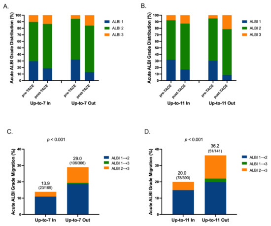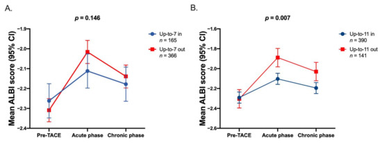 3.3. Distribution of ALBI Grade before and after TACE in Acute Phase by Different Tumor Size plus Tumor Number Criteria