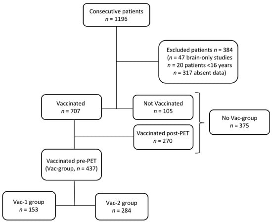 Out of 1196 PET/CT, beyond the aforementioned 47 brain-only scans, 337 additional exams were excluded from the analysis with a reason: 20 because they were performed on patients younger than 16 years of age and 317 for the lack of vaccination data. Among the remaining 812 patients, 707 were vaccinated and 105 received no dose. Of all vaccinated patients, 437/707 received at least the first dose before the PET scan (Vac-group; mean age 64 ± 14 years, range 21–88, female 205, male 232), while 270/707 were vaccinated after the PET scan and included in the No Vac-group.