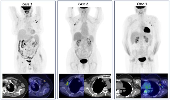 Three cases of vaccine-associated hypermetabolic lymphadenopathy (VAHL) detected on [18F]FDG PET/CT. Case 1: [18F]FDG PET/CT performed in a 67-year-old woman for left breast cancer follow-up and increased tumor markers. The images showed [18F]FDG-uptake in left supra- and retro-clavicular lymph nodes (maximum standardized uptake value, SUVmax 3.3) as well as homolateral axillary lymphadenopathy (SUVmax 7.0), classified as grade 3. Patient medical history reported the booster vaccine dose injection ipsilateral to PET findings 7 days before examination. Case 2: [18F]FDG PET/CT performed in a 42-year -old woman for melanoma of right dorsal region follow-up. The images showed [18F]FDG-uptake in right subclavicular and interpectoral lymph nodes (SUVmax 3.9), classified as grade 2. Patient medical history reported the booster vaccine dose injection ipsilateral to PET findings 16 days before examination. Case 3: [18F]FDG PET/CT performed in a 80-year-old man for follow-up of superior diaphragmatic non-Hodgkin lymphoma. The images showed [18F]FDG-uptake in left cervical, subclavicular and axillary lymph nodes (SUVmax 14.5), classified as grade 3. Patient medical history reported the booster vaccine dose injection ipsilateral to PET findings 2 days before examination. All these findings were VAHL, considering clinical history and the lymph nodes features on co-registered CT images.