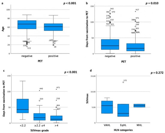 Furthermore, SUVmax significantly changed during different time intervals, with the lowest values beyond the 20-day interval from vaccine-to-PET (p < 0.001) (Figure 3c and Figure 4). Conversely, no statistical difference in SUVmax value was found in HLN risk class (p = 0.272) (Figure 3d).