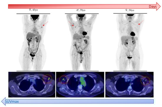 - Singh, B.; Kaur, P.; Kumar, V.; Maroules, M. COVID-19 vaccine induced Axillary and Pectoral Lymphadenopathy on PET scan. Radiol. Case Rep. 2021, 16, 1819–1821. [Google Scholar] [CrossRef] [PubMed]