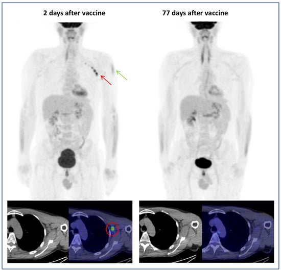 A 53-year-old man in follow-up for left supraclavicular melanoma (pT2aN0M0). [18F]FDG PET/CT exam performed 2 days after vaccination showed axillary (SUVmax 9.1) and interpectoral (SUVmax 3.5) hypermetabolic lymphadenopathies (HLNs) (red arrow) and [18F]FDG-uptake in left deltoid (injection site, green arrow). Being the HLNs ipsilateral to the site of the previous melanoma, a PET revaluation 77 days after vaccination was performed, showing the disappearance of FDG-avid lymphadenopathies in absence of therapy.