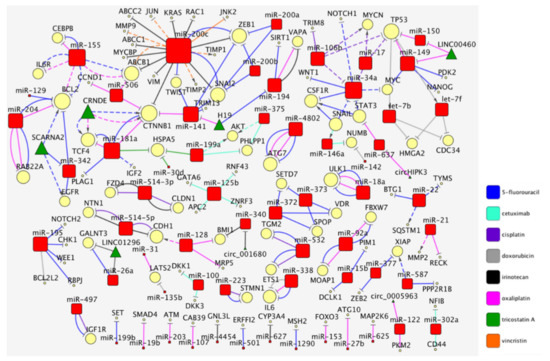 The molecular networks of miRNAs and their targets in colon cancer drug resistance. Each network shows the miRNAs/targets (nodes), or drug resistances (edges) described in at least two articles. MiRNAs are identified with red, rounded squares and the targets with yellow circles. The connecting edges corresponds to the drug resistance (color-coding for the drugs is reported in the legend). We used continuous lines for pairwise (first order) interactions and dashed for secondary (higher order) ones. Flat arrows indicate repression, while pointed arrowheads indicate activation. The map size of the miRNAs (red squares), targets (yellow circles) and non-coding RNA upstream regulators (green triangle) depends on the node degree. The data used to generate the networks are listed in Table S2.