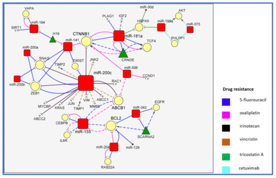 The members of the miR-200 family (miR-200a/b/c and miR-141) and miR-181a play a pivotal role in the multidrug resistance of colorectal carcinoma. These miRNAs were considered as suppressors of cancer growth and metastasis through the regulation of different molecular pathways. MiR-200c and miR-181a are the most-connected miRNAs participating in this network, and both inhibit catenin beta 1 (CTNNB1) expression, a key target associated with three different drug resistances (Figure 2).
