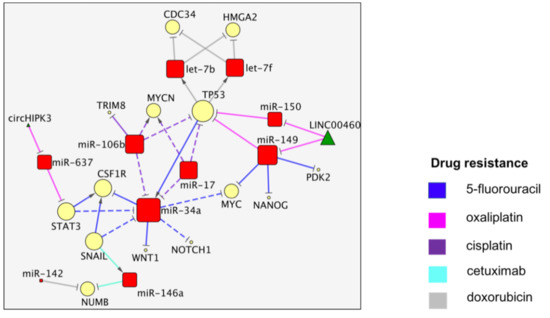 The coding genes’ nomenclature was standardized by using the HUGO Gene Nomenclature Committee (HGNC). In the network, we used a shape code to graphically highlight miRNAs (red square), their targets (yellow circle), miRNA upstream regulators (green triangle) and each type of drug (connection) with a specific color, as indicated in the legend of Figure 1. Each connecting edge corresponds to a single publication; thus, different lines of the same color indicate a different paper. To better visualize the most connected miRNAs, the node size is proportional to its degree (the number of links between a miRNA and its targets or vice versa); we assigned to lower degrees of value a smaller size. All information, extracted during human curation, on the miRNA/target/drug and the relative references is reported in Table S1. In the following paragraphs, we will describe the most prominent miRNA/target interactions within the context of drug resistance in colorectal cancer (CRC).