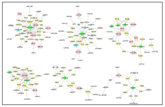 In this paper, we have hitherto discussed the miRNAs and their interactions, either the first or higher order, to understand the mechanisms underlying various types of chemoresistance in CRC. Protein targets were included in the network and provided the connections of non-coding RNAs with the molecular effectors in apoptosis, cell proliferation and other major cellular processes of CRC. In some of these networks, members of the other classes of non-coding RNAs, such as lncRNAs or circular RNAs, also participated. At this stage, we wished to dig further into the intricate web of gene networks by using a different point of view, namely that of an all-in drug interaction. We obtained such a view by considering the drug nodes rather than, as above, edges. The resulting network is quite complex, and we report it integrally in Figure S1, highlighting the most connected drug resistance (green rhombuses) and their relations with the miRNAs (red squares) and miRNA targets (yellow circles) in CRC. The upstream regulators of miRNAs are indicated as sky-blue triangles. The map node size was proportional to the node’s degree, and the relative statistics are listed in Table S5. Since this drug-centric network is highly connected, unlike the one of Figure 1, we looked for embedded clusters, using a community analysis, implemented by the GLay plugin in Cytoscape. Figure 5 shows the six major clusters identified within the drug-centric network. The largest cluster, on the top left, includes the miRNAs and proteins regulating the resistance to 5-FU: miR-155, miR-342 and miR-204 are the miRNAs with the highest degrees, while BCL2 and ABCB1 are the most prominent among proteins. In the L-OHP cluster miR-92, miR-181a and miR-506 are the most connected, and CTNNB1 is the protein with the highest degree. While, in the previous two clusters, there was only one drug, CPT11 and VCR share together another cluster, with EMT gene representation (miR-200c/miR141 and ZEB1/SNAI2 and VIM). DOXO, axitinib, sorafenib and nutlin are all in another cluster, which comprises miR-17, miR-106b, let-7b/f, miR-34a and miR-146a, alongside TP53, TRIM8, MYCN and CDC34. The biological process for the seven genes in this cluster is the ‘positive regulation of cell death’ (FDR = 9.2 × 10−3) as calculated using the PANTHER Over-representation Test. The CET and TSA cluster includes miR-125b and miR-199a and AKT1 as a protein target. The CET/TSA cluster corresponds to Wnt signaling in the GO biological process (FDR = 1.2 × 10−4). CDDP spans miR-514 and miR-532, and the GO analysis points to gland development and other processes involved in cell differentiation.