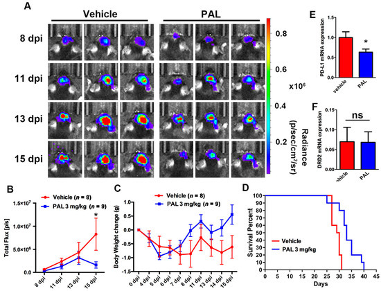 Paliperidone reduces GBM growth and PD-L1 expression and prolongs survival in the intracranial xenograft mouse model. ALTS1C1-luciferase GBM cells were implanted into mice brain, and the mouse was subjected to once daily intraperitoneal injection with paliperidone (PAL; 3 mg/kg) or vehicle. The tumor size was examined at the indicated time points (8, 11, 13, and 15 dpi) by IVIS image. Representative images from each group are shown (A). Quantification of tumor size is shown (B). The body weight changes are shown in (C). (D) Kaplan–Meier survival curve showed that mice with treated with paliperidone (PAL; 3 mg/kg) exhibited longer survival than the vehicle group (p = 0.02). Quantitative data are presented as mean ± SEMs.e.m. Messenger RNA levels of PD-L1 (E) and DRD2 (F) in the intracranial GBM were examined by real time PCR for day 24. * p < 0.05 compared with the vehicle control (Student’s t-test). Abbreviations: dpi: days post-implantation.