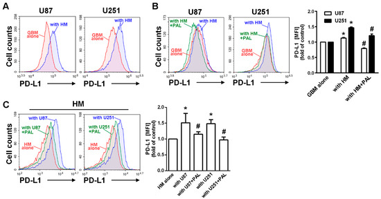 DRD2 involved in the PD-L1 expression in GBM cells in the GBM-macrophage co-culture system. (A) U87-GFP and U251-GFP cells were co-cultured with the THP-1 differentiated macrophage for 48 h. PD-L1 expression was determined by flow cytometry analysis. (B) U87-GFP and U251-GFP cells were treated with paliperidone (20 μM, PAL) for 30 min, and cells were then co-cultured with THP-1 macrophages (HM) after wash-out of paliperidone for 48 h. PD-L1 expression on GBM was determined by flow cytometry analysis. * p < 0.05 compared with GBM alone group. # p < 0.05 compared with THP-1 group. (C) THP-1 macrophages (HM) were treated with paliperidone (20 μM, PAL) for 30 min, washed out for 48 h, and then co-cultured with U87-GFP and U251-GFP cells. PD-L1 expression on cell surface of HM was determined by flow cytometry analysis. * p < 0.05 compared with THP-1 alone group. # p < 0.05 compared with U87 or U251 groups (n = 3–4).