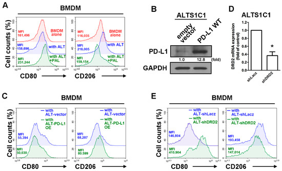 DRD2 and PD-L1 in GBM are involved in the polarization of TAMs in the GBM-macrophage co-cultured system. (A) BMDMs were co-cultured with ALTS1C1-GFP cells and then treated with or without PAL (20 μM) for 48 h. CD80 and CD206 expressions were determined by flow cytometry analysis. (B) Establishment of stable PD-L1 expression in ALTS1C1-GFP cells. The expression of PD-L1 was verified by Western blot. (C) BMDMs were co-cultured with PD-L1 ALTS1C1-GFP cells for 48 h. CD80 and CD206 were determined by flow cytometry analysis. (D) ALTS1C1-GFP cells were transfected with DRD2, and the expression of DRD2 was verified by real time-PCR. * p < 0.05 compared with shLacz group. (E) BMDMs were co-cultured with DRD2 knockdown of ALTS1C1-GFP cells for 48 h. CD80 and CD206 were determined by flow cytometry analysis.