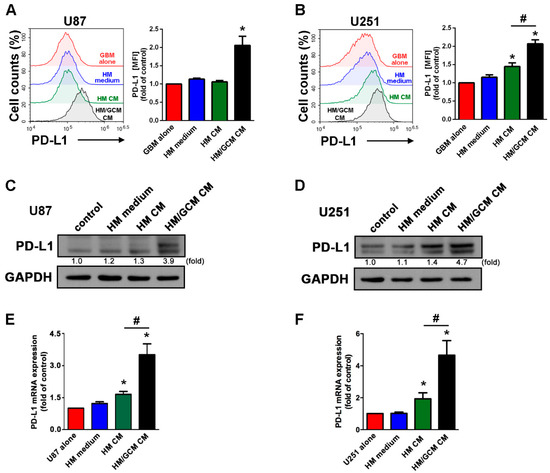 In order to further examine whether upregulation of PD-L1 in GBM requires direct contact interaction with macrophages. We determined the expression of PD-L1 in GBM upon stimulation with conditioned medium (CM) from either differentiated human macrophages (HM CM) or GBM-CM (GCM)-primed human macrophages (HM/GCM CM). As shown in Figure 4A,B, HM/GCM CM significantly induced PD-L1 expression on both human U87 and U251 GBMs compared with treatment with HM medium or HM CM. In addition, the stimulation of HM CM only slightly increased PD-L1 expression in GBM (Figure 4B). In addition, the stimulation of HM/GCM CM also markedly induced PD-L1 protein expression in both human U87 (Figure 4C) and U251 GBMs (Figure 4D). The mRNA levels of PD-L1 in GBM also significantly increased after stimulation with HM/GCM CM than compared to HM CM (Figure 4E,F). In the meantime, there was only a mild increase in PD-L1 in GBM induced by HM CM. Our results suggest that the macrophage-induced PD-L1 expression on GBM does not require a direct contact type of interaction between GBM and macrophages. We also found that the CMs of macrophages after being primed by GCM had more potential than the CMs of naïve macrophages in inducing PD-L1 expression in GBM.