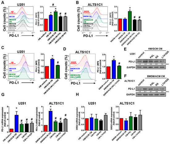 DRD2 is involved in the interaction of GBM-macrophage-induced PD-L1 expression in GBM. (A,C,E) Human U251 GBMs were incubated with human macrophage (HM) cultured medium, HM CM or HM/GCM CM, and then treated with paliperidone (20 μM, PAL), risperidone (20 μM, RS), or L741626 (1 μM) for 48 h. (B,D,F) Mouse ALTS1C1 GBMs were incubated with BMDMs cultured medium, BMDMs CM or BMDM/ACM CM, and then treated with or without PAL (20 μM), risperidone (20 μM, RS), or L741626 (1 μM) for 48 h. PD-L1 expression on the cell surface was determined by flow cytometry analysis (A–D) and Western blot (E,F). * p < 0.05 compared with HM medium group. # p < 0.05 compared with HM/GCM CM group. (n = 3–4) (G,H) mRNA levels of PD-L1 and DRD2 were determined by real-time PCR. * p < 0.05 compared with HM medium or BMDMs medium groups. # p < 0.05 compared with HM/GCM CM or BMDM/ACM CM groups (n = 3).