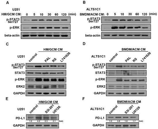 ERK and STAT3 signaling pathways are involved in the interaction of GBM-macrophage-induced PD-L1 expression in GBMs. Human U251 (A) and mouse ALTS1C1 (B) GBM were incubated with HM/GCM CM or BMDM/ACM CM for the indicated time periods (5, 10, 30, 60, or 120 min). Human U251 (C) and mouse ALTS1C1 (D) GBM were treated with PAL (20 μM), RS (20 μM), or L741626 (1 μM) and incubated with HM/GCM CM or BMDM/ACM CM. Phosphorylated-STAT3 and phosphorylated ERK expressions were determined by using Western blot analysis. Human U251 (E) and mouse ALTS1C1 (F) GBM were treated with S31-201 (30 μM) or U0126 (1 μM) and incubated with HM/GCM CM or BMDM/ACM CM for 48 h. PD-L1 expression was determined by using Western blot analysis. (n = 3–4).