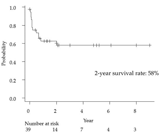 The clinical features of primary anaplastic large cell lymphoma of the central nervous system have been summarized in Table 2. The median age was 21 years (range, 1–82 years), and the female-to-male ratio was 0.18. With regard to the imaging findings, 80% of cases presented with meningeal involvement and 38% of cases had multiple lesions. Cell markers were described in detail in 37 cases, 30 cases (81%) were T-cell type, and seven cases were null-cell type (19%). Regarding treatment methods, of the 33 cases that received surgical treatment, 16 were biopsies and 17 were tumor resections (including total or partial resection), and the ratio of biopsy and resection was approximately 50%. MTX-based chemotherapy was administered in 62% of the cases. The overall 2-year survival rate of ALCL was 58% (Figure 2), a poorer prognosis than that of general PCNSL (2-year survival rate: 90%) [43].