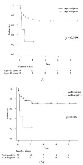 As mentioned above, the average observation period for the 39 cases was 13 months. Univariate analyses via the log-rank test for each demographic and medical factor (age, sex, ALK status, lesion multiplicity, meningeal lesions, MTX chemotherapy, and radiation therapy) showed statistically significant differences in the prognosis for age < 40 years (p = 0.029), ALK-positive tumors (p = 0.005), and MTX treatment (p = 0.0009). Specifically, the 2-year survival rates for ALK-positive and ALK-negative cases were 71% and 22%, respectively (Figure 3).