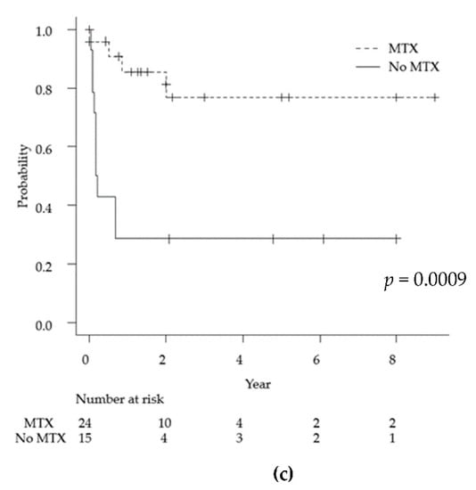 A Cox regression analysis was performed to search for factors related to prognosis. As a result, age < 40 years (p = 0.039, HR 0.32 (0.11–0.95)), ALK-positive tumor (p = 0.010, HR 0.24 (0.08–0.71), and MTX-based chemotherapy (p = 0.003, HR 0.17 (0.05–0.56)) were factors associated with a good prognosis. No statistically significant differences were observed in terms of sex, single or multiple lesions, meningeal lesions, or radiation therapy (Table 3).
