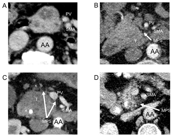 Each scan was re-evaluated and the following parameters were recorded: (1) Tumor diameter and distance to posterior and medial anatomic margins, and (2) mesopancreatic fat stranding. Furthermore, the presumed contact of the tumor to the superior mesenteric artery (SMA), common hepatic artery (CHA), gastroduodenal artery (GDA) portal, and superior mesenteric vein (PV/SMV) was analyzed and further sub-categorized by the circumferential degree of invasion (</>180°). For mesopancreatic stranding (MPS), the following grading system was applied: MPS 0: No fat infiltration, MPS 1: Infiltration of mesopancreatic fat < 2 mm, MPS 2: Infiltration > 2 mm without immediate major vessel contact, and MPS 3: >2 mm invasion of the mesopancreatic fat with immediate major vessel contact (Figure 1A–D and Figure 2A–D).