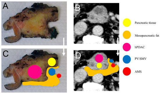 Histopathological slides were re-evaluated by two experienced pancreatico-hepatobiliary pathologists (IE, LH) [16] (Figure 2A,C). Mesopancreatic fat invasion of the dorsal resection margin and the resection margin status were re-evaluated for each patient. If described in the histopathological report, cancerous infiltration of tissue surrounding the SMA and PV/SMV was obtained and compiled into a database.