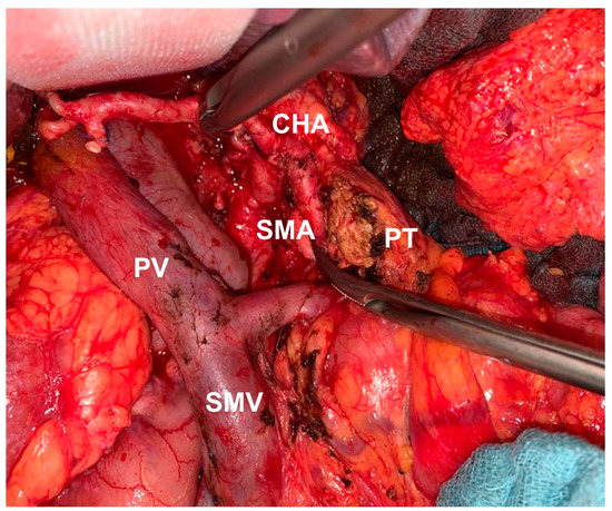 Operative situs after mesopancreatic excision during PD (CHA: Common hepatic artery; PV: Portal vein; PT: Pancreatic tail; SMA: Superior mesenteric artery; SMV: Superior mesenteric vein).