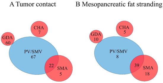 Mesopancreatic stranding (MPS) dorsal to the head of the pancreas was sub-grouped as described in Materials and Methods (Figure 1A–D). In only 60 patients, MPS was not visible (24.8%), whereas MPS 1, 2, and 3 were found in 69 (28.5%), 33 (13.6%), and 80 (33.1%) patients, respectively. Out of the 80 MPS, isolated peri-vascular fat stranding around the PV/SMV was detected in eight patients (10.0%), whereas isolated fat stranding around the SMA was detected in 18 patients (22.5%). In 39 patients (48.8%), both PV/SMV and SMA showed a simultaneous fat stranding. Fat stranding around the GDA and CHA was visible in 10 (12.5%) and in five patients (6.25%), respectively (Table 1 and Figure 4B).