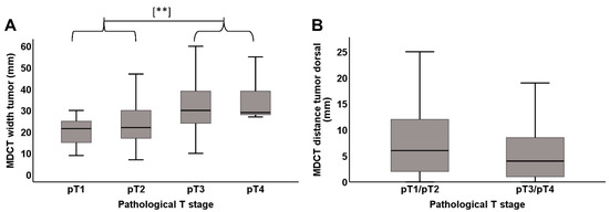 (A) Box plot of radiographically assumed tumor width and pathological T-stage. Pearson test was used to test for statistical difference between pT1+2 vs. pT3+4 (p = 0.001) ** indicates a p-value ≤ 0.01. (B) Box plot of radiographically assumed tumor distance to dorsal margin (ICV/AA) in relation to the pathological T-stage. Pearson/spearman test was used to test for statistical significance (p = 0.011).